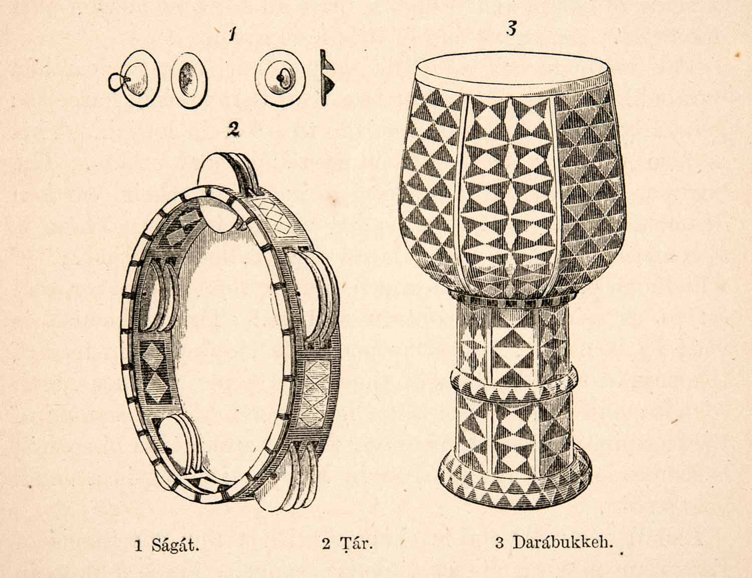This is an original 1871 black and white in-text wood engraving of ancient Egyptian musical instruments including the Zill (Ságát), tiny metallic cymbals; a tambourine (Tár), a musical instrument in the percussion family; and a "Darábukkeh", a drum.
