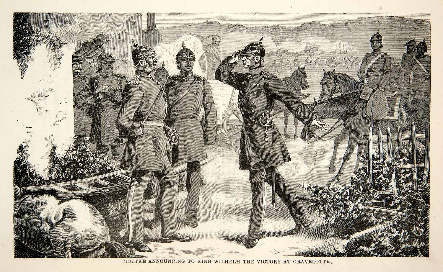 Keywords specific to this image: Military, Battle of Gravelotte, Army, Commander, German, Franco German War, Uniform, Officer, Royalty, Horse, Soldiers, Saber