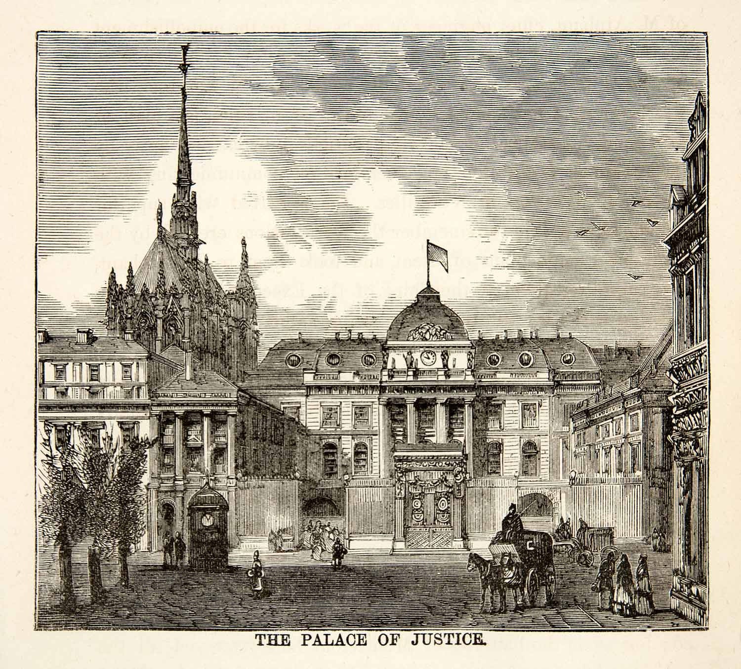Keywords specific to this image: Building, Royal, Sainte Chapelle, Parlement, Palais de Justice, Cour du Mal, Horse, Carriage, Courtyard, Square, Cobblestone