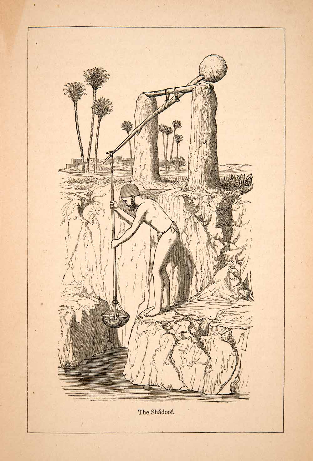 This is an original 1871 black and white in-text wood engraving of a "Shádoof", an Egyptian agriculture soil machine consisting of two posts or pillars of wood or canes with an horizontal piece of wood extending from top to top to which is suspended a slender lever, formed of a branch of a tree, and a water vessel.