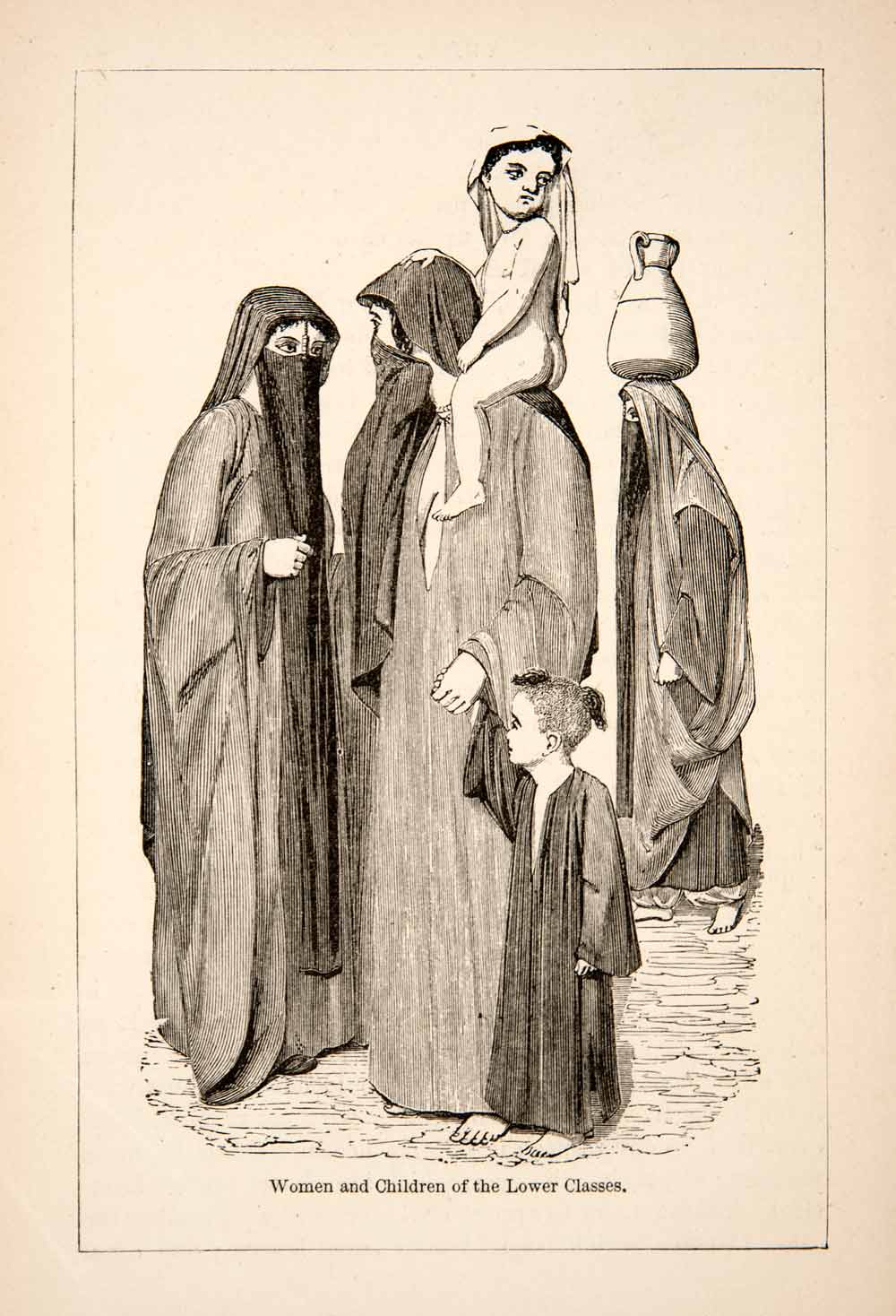This is an original 1871 black and white in-text wood engraving of a traditional costume worn by women of Egypt. For a married lady the Niqãb or "Habarah" is black silk and for a single woman the shawl is white silk.