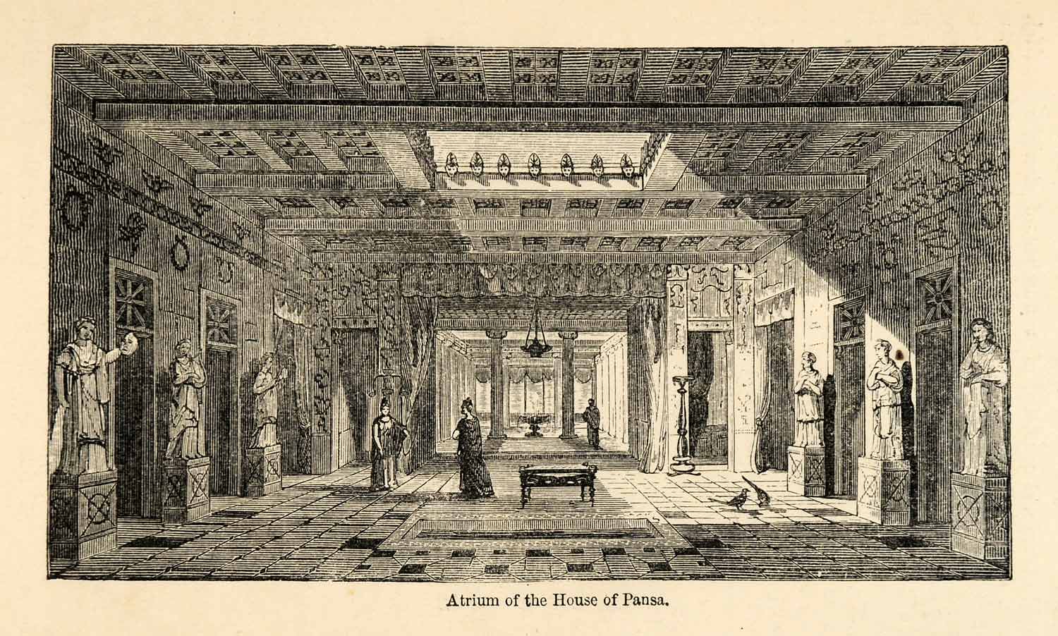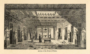 This is an original 1871 black and white woodcut of the atrium of the House of Pansa located in Pompeii, Italy. The structure functioned as a hotel of sorts, offering rooms available to rent to