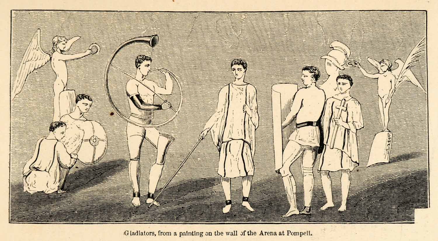 This is an original 1871 black and white woodcut of Roman gladiators depicted from a wall on the Amphitheater in Pompeii, Italy. Judging from the image that shows what little the gladiators were equipped with, its no wonder most of them died in the arena.