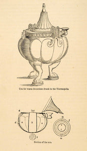 This is an original 1871 black and white woodcut of an urn used for warming decoctions such as tea or coffee found at the Thermopolia at Pompeii, Italy. In ancient Rome, Thermopolium were commercial establishments that sold ready-to-eat food, the modern day equivalent to a fast food restaurant.