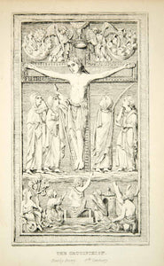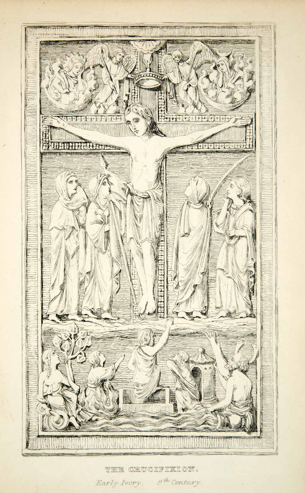 This is an original 1872 monochrome photolithograph of an illustration from a 9th century ivory of Jesus Christ on the Cross.