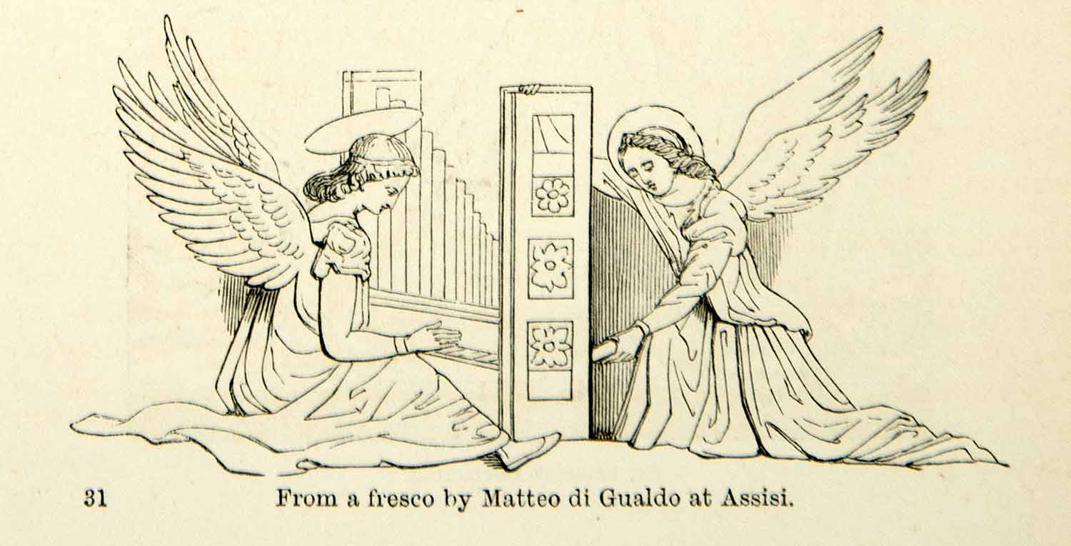 This is an original 1872 black and white relief line-block print of two musical angels from a fresco by Matteo di Gualdo at Assisi, Italy.