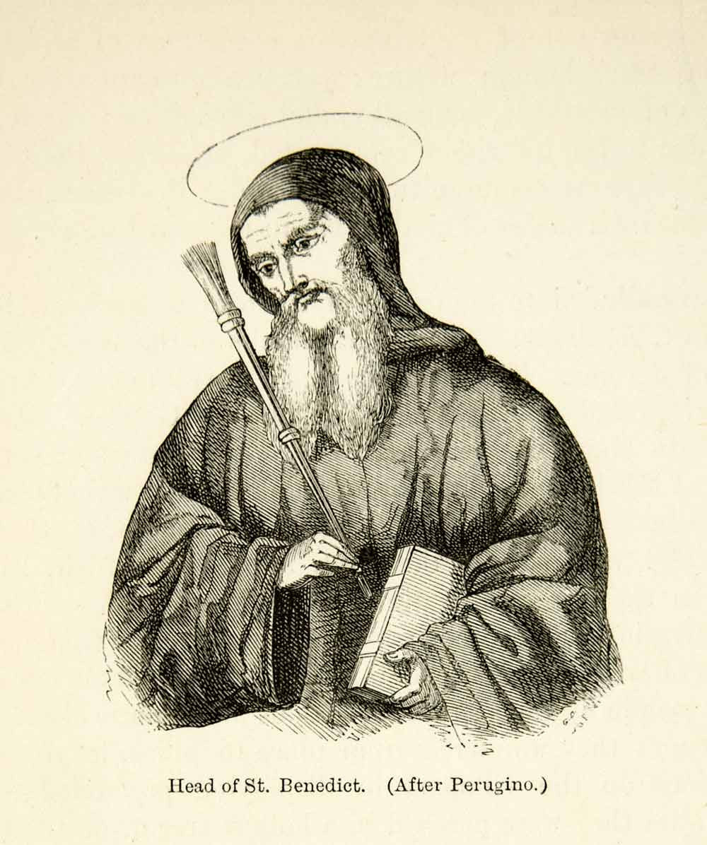 This is an original 1872 black and white relief line-block print of the head of St. Benedict from a painting by Pietro Perugino.
