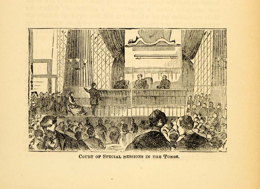 This is an original 1872 halftone print of the Court of Special Sessions in the Tombs in New York City. (Please note that there is printing on the reverse.)