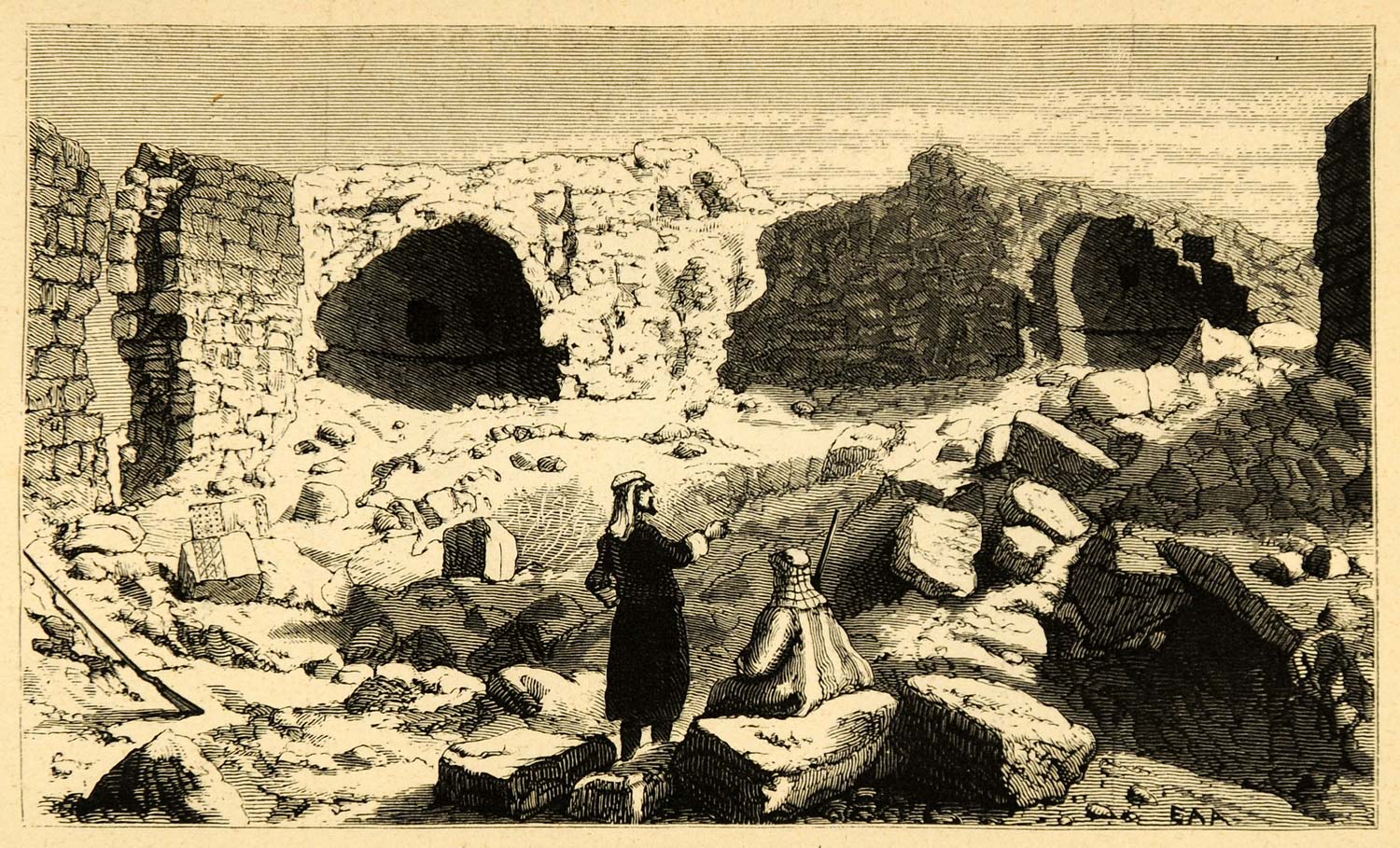 This is an original 1872 black and white wood engraving of an interior of a church in what we believe to be al-Auja in the Jericho Governorate of Palestine.