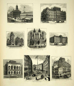 This is an original 1872 black and white in-text wood engraving of artwork that depicted historic Faneuil Hall, the Quincy Marketplace, the Post Office building, the Boston & Lowell Railway Station, the Grand Organ inside the Boston Music Hall, St. James's Hotel, the Public Library, Franklin Street, and the Washington Street transcript office in the city of Boston, Massachusetts, USA during the Victorian Era.