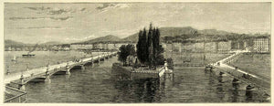 This is an original 1872 black and white in-text wood engraving of artwork that depicted a historic cityscape of Geneva, Switzerland, Europe during the Victorian era. The peaks of Mont Saléve and Mont Blanc can also be seen in the distance.
