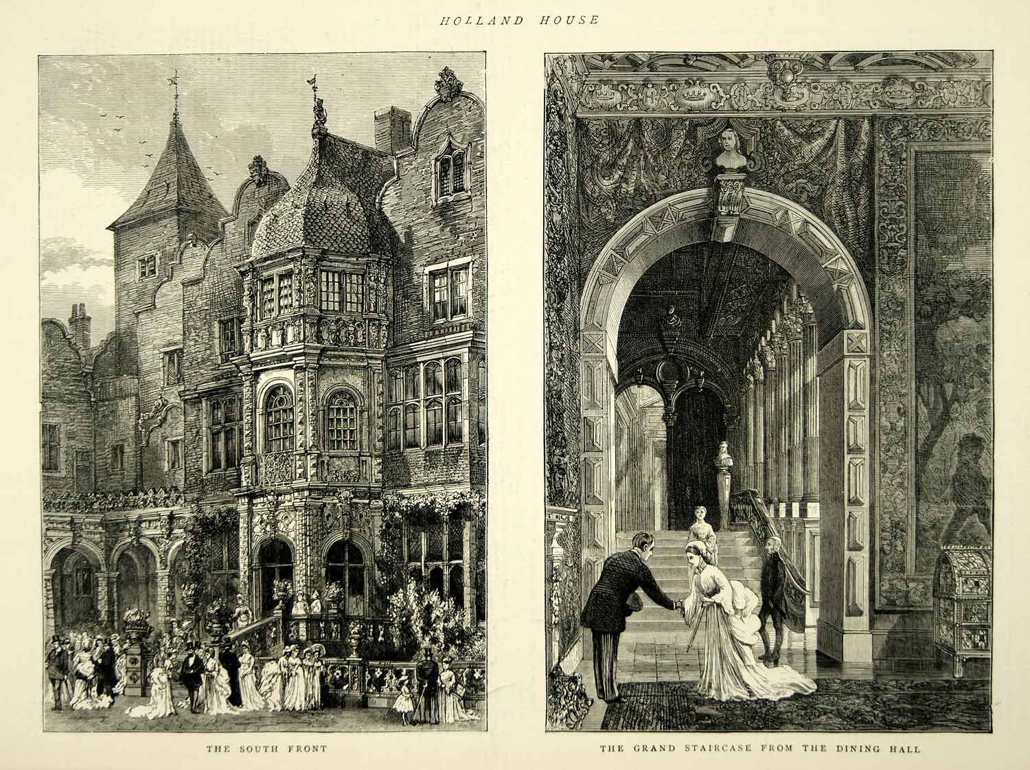 This is an original 1872 black and white in-text wood engraving of artwork that portrayed the south front and the grand staircase from the dining hall of the historic Holland House, (or Cope Castle), that is located in Kensington, London, England, United Kingdom.