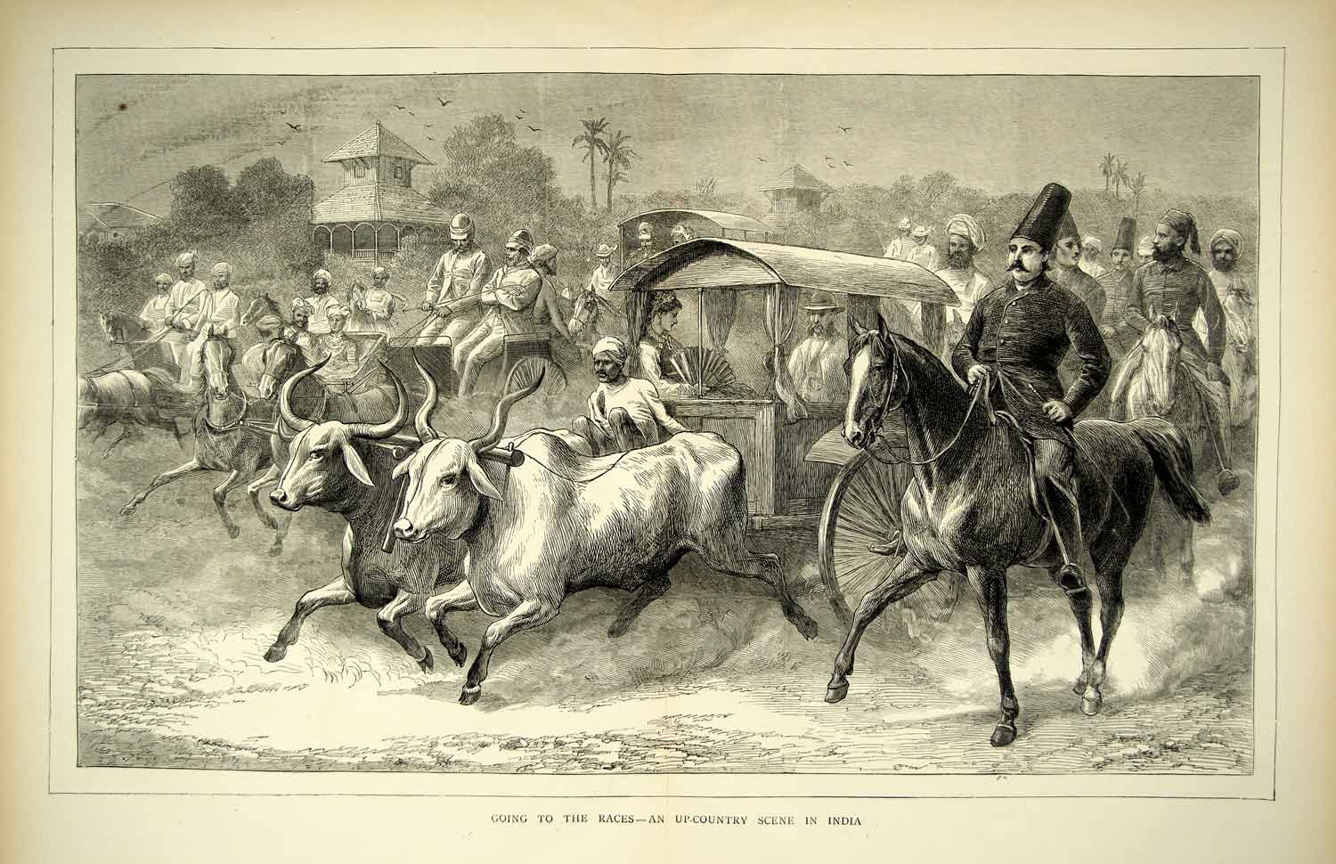 1872 Wood Engraving Art Horse Race Sports India Asia Victorian Zebu Ox YTG3