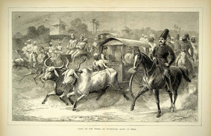This is an original 1872 black and white in-text wood engraving of artwork that portrayed a group of British and Indian citizens traveling to watch the horse races in India during the Victorian era.