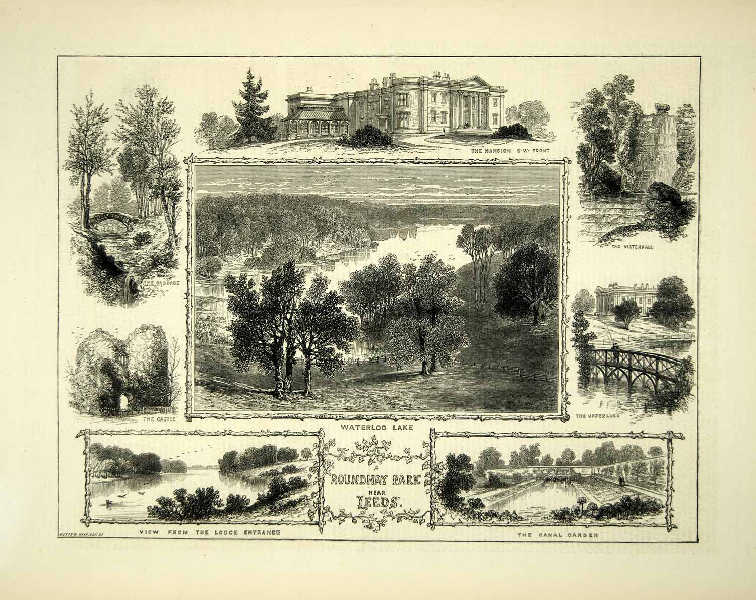 This is an original 1872 black and white in-text wood engraving of artwork that depicted several landscapes and landmarks of Roundhay Park in Leeds, West Yorkshire, England, United Kingdom during the Victorian Era, including; The Greek-Revival style Mansion House built for Thomas and Elizabeth Nicholson between 1811-1826, Waterloo Lake, the Canal Gardens, the folly "Castle" built by George Nettleton in 1812, Upper Lake, and the waterfall and cascade.