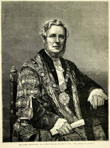 This is an original 1872 black and white in-text wood engraving of artwork that portrayed Sir Sydney Waterlow, 1st Baronet who served as the Lord Mayor of London, England, United Kingdom from 1872-73 during the Victorian Era.