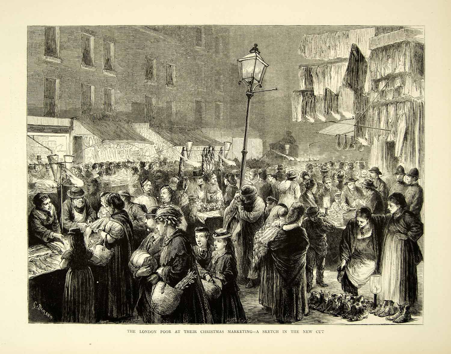 This is an original 1872 black and white in-text wood engraving of artwork by G. Durand that portrayed the working poor shopping at a Christmas market in London, England during the Victorian era.