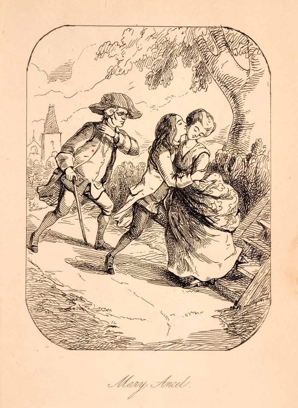This is an original 1872 black and white wood engraving of a sketch by English novelist William Makepeace Thackeray (1811-1863) which accompanies the story of the fair Mary Ancel, a maiden from Alsace-Lorraine, France. The youth embracing her in the illustration was her cousin, they were extremely fond on one another. The man about to smack him is her father, Edward. Although their love was requited, they never married, as circumstance saw it fit to send them in different directions.