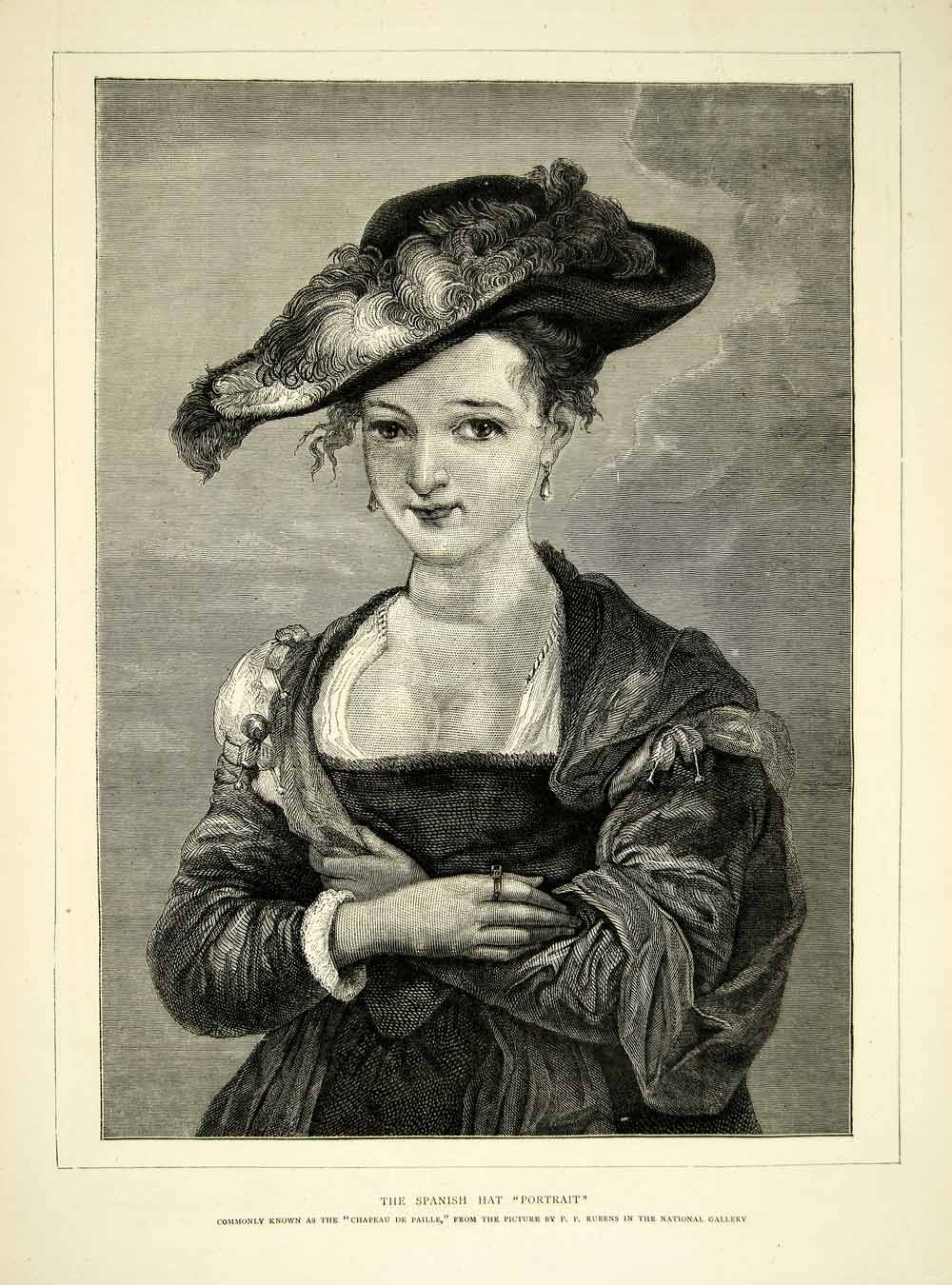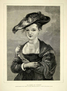 This is an original 1872 black and white wood engraving of a portrait by Peter Paul Rubens of a woman wearing a fashionable straw hat.