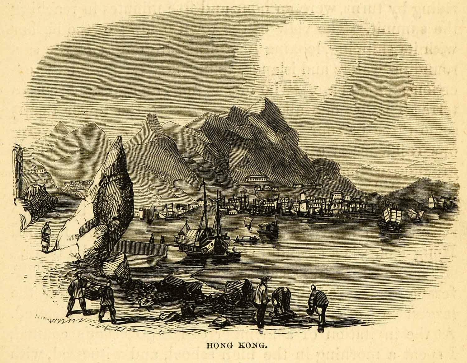 This is an original 1872 black and white in-text wood engraving of a port-side view of Qing Dynasty Hong Kong, China from Victoria Harbor.