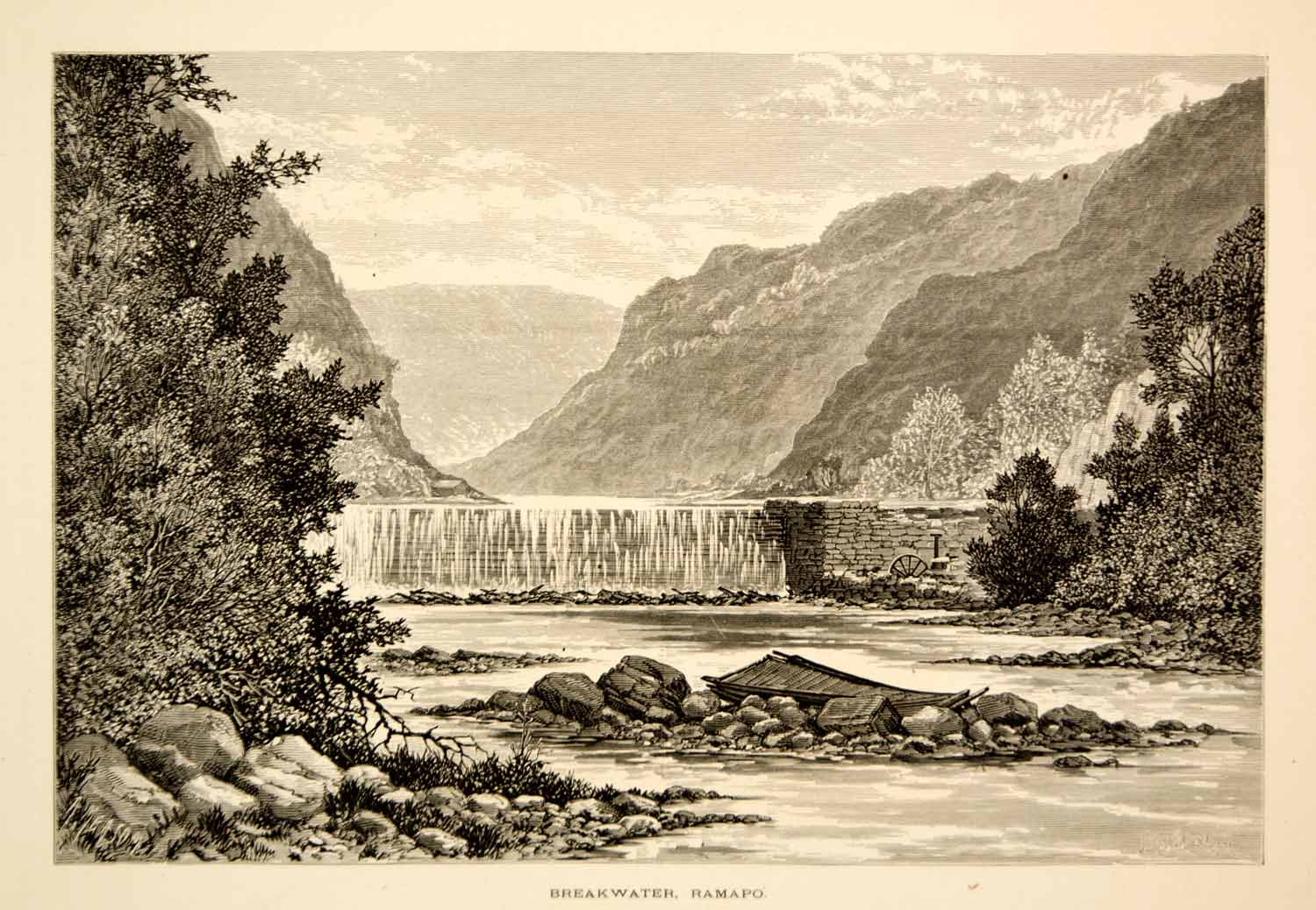 This is an original 1872 black and white in-text wood engraving of an illustration by Jules Tavernier of a dam on the Ramapo River in northern New Jersey.