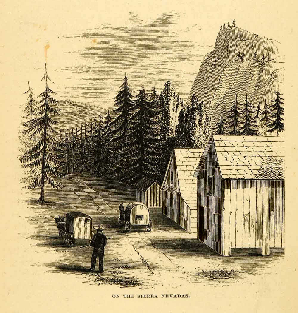This is an original 1872 black and white in-text wood engraving of a settler's homestead in the Sierra Nevada of the Southwestern United States.