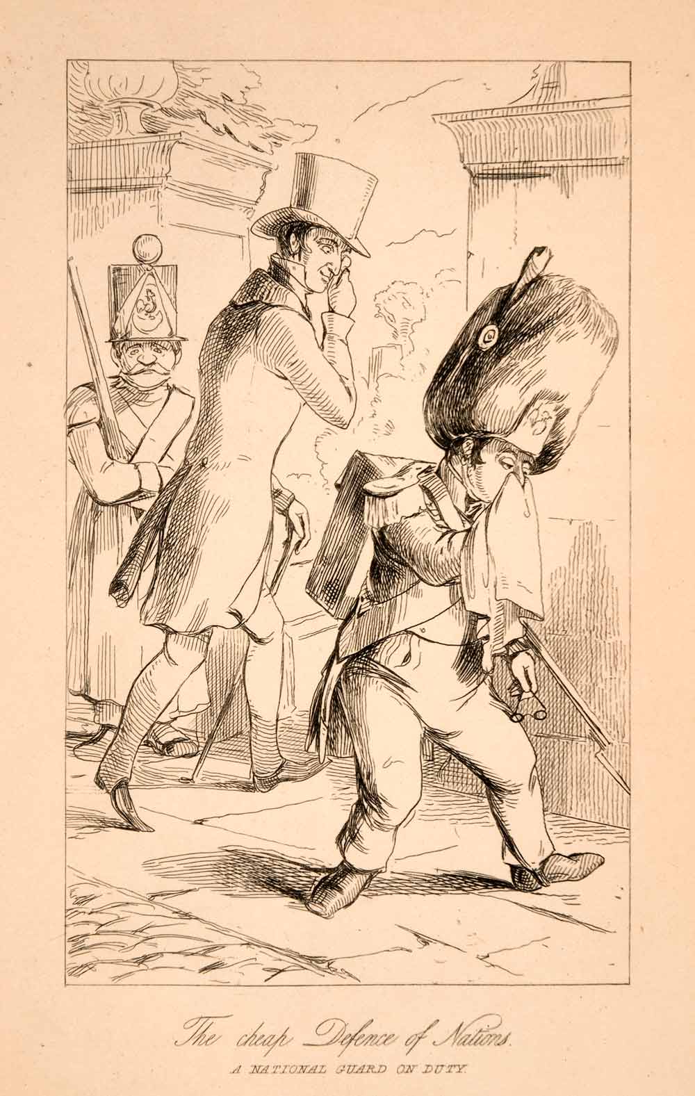 This is an original 1872 black and white wood engraving of a sketch by English novelist William Makepeace Thackeray (1811-1863) entitled "The Cheap Defense of Nations--A National Guard on Duty." Thackeray was famous for his satirical perspective, and is generally considered to be second only to Charles Dickens in Victorian era English literature.