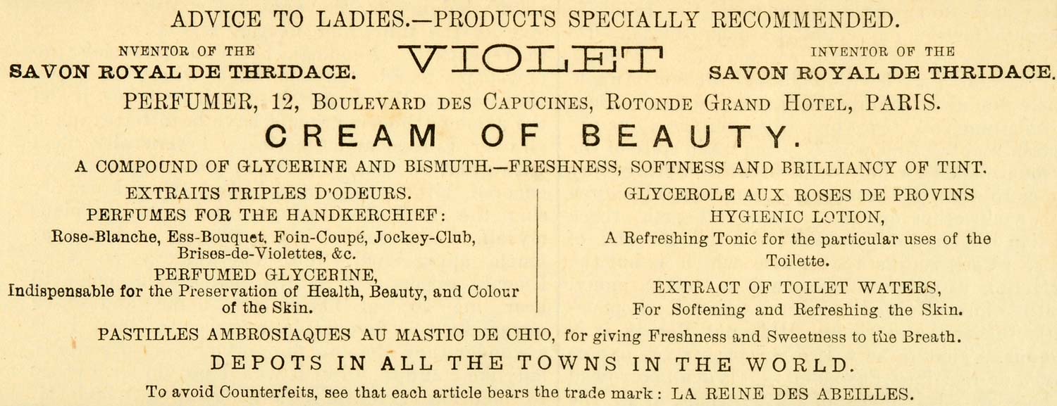 This is a small original 1873 black and white print ad for the La Reine Des Abeilles Cream of Beauty from Savon Royal de Thridace.