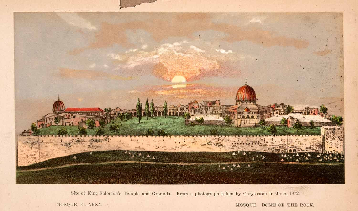 This is an original 1873 color chromolithograph of the Site of King Solomon's Temple and Grounds. This image was taken from a book of travels from M. Wolcott Redding.