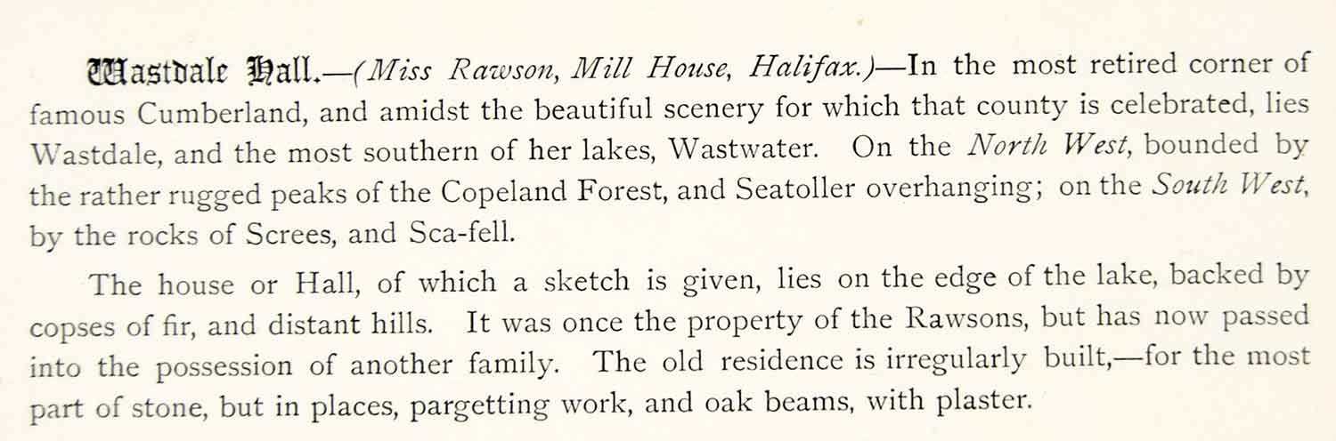 This is an original 1873 black and white lithograph of a drawing by Miss Rawson of the historic Wasdale Hall in Seascale, Cumbria and of St. George's Church in Mickley, Northumberland in England, United Kingdom. The Wasdale Hall was built during the 1820's and is currently used as a Youth Hostel. St. George's Church was built in 1830.