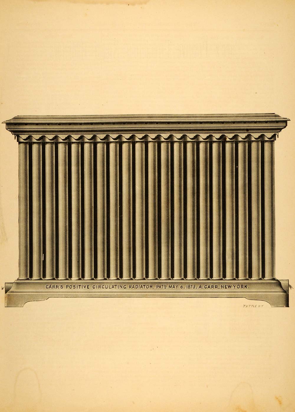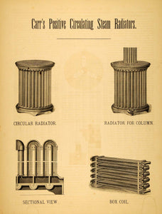This is an original 1873 double-sided halftone print with illustrations of Carr's Positive Circulating Steam Radiators including a Circular Radiator; a Radiator for a column; a sectional view of a radiator; and a box coil.