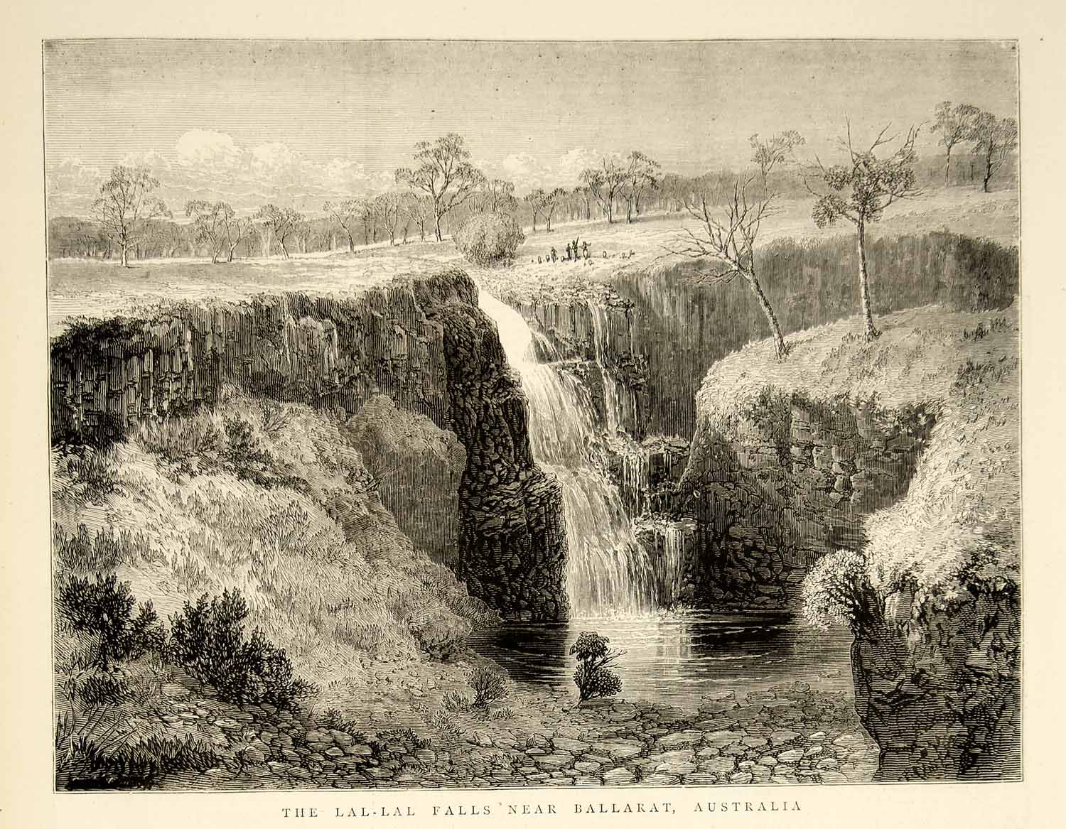 This is an original 1873 black and white in-text wood engraving of an illustration that depicts the scenic landscape of the Lal-Lal Falls along the Moorabool River near the city of Ballarat, Victoria, Australia during the Victorian era.