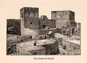 This is an original 1873 black and white wood engraving of the Castle of David in Jerusalem. This image was taken from a book of travels from M. Wolcott Redding.