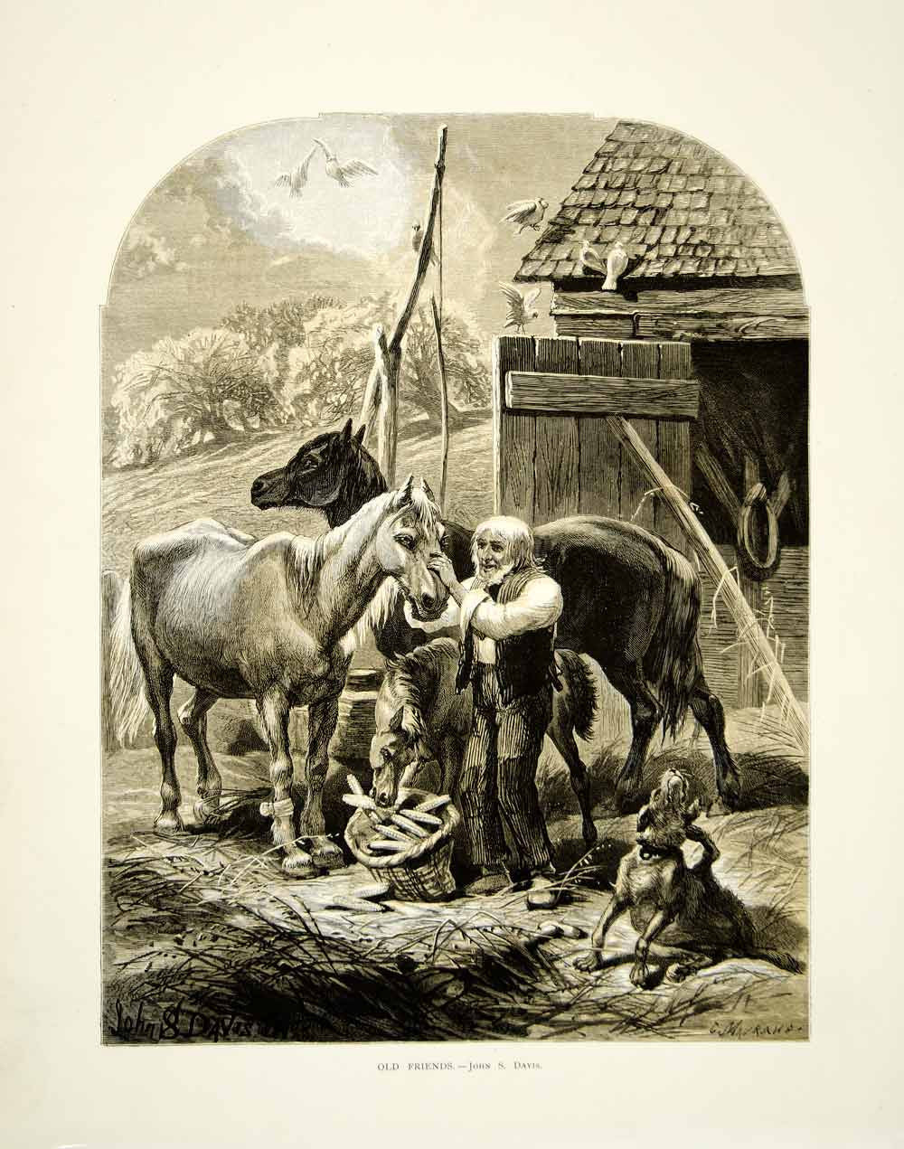 This is an original 1873 two-color wood engraving of a painting by John Steeple Davis (1841-1917) entitled "Old Friends" that portrayed an old farmer feeding his horses.