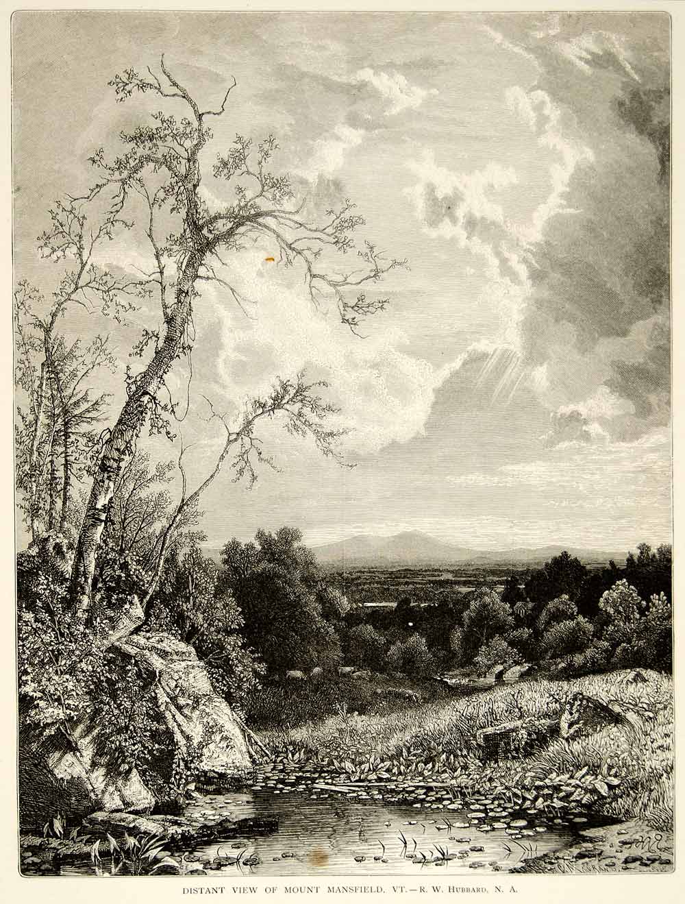 This is an original 1873 black and white in-text wood engraving of a painting by Richard William Hubbard (1816-1888) that depicted the scenic landscape of Mount Mansfield in Vermont, USA.