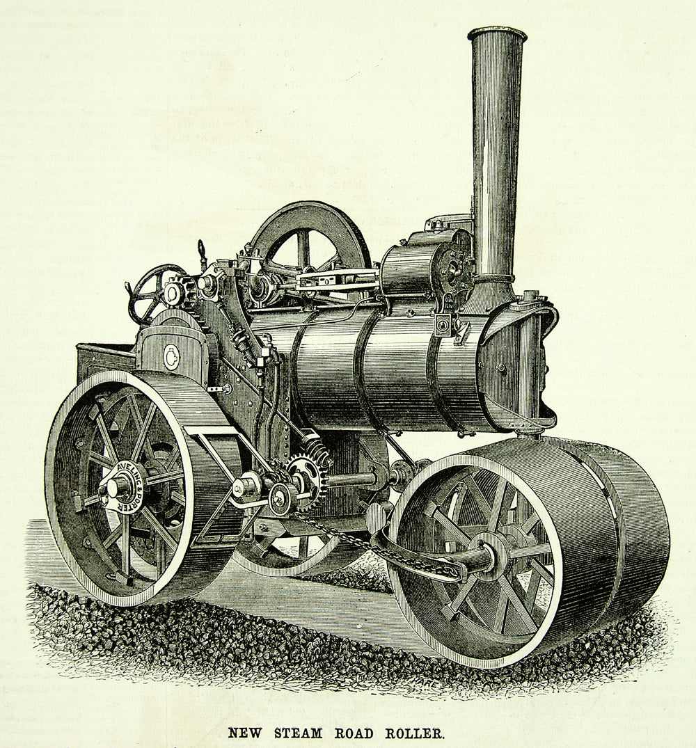 This is an original 1871 black and white in-text wood engraving of a steam road roller built by Aveling and Porter of Rochester, England.