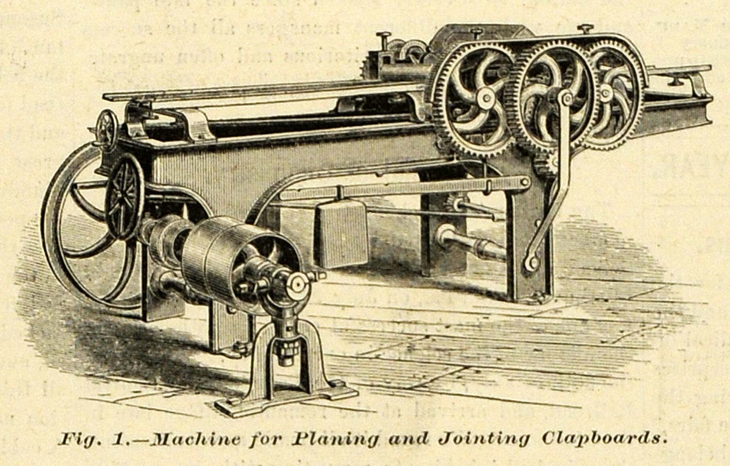 This is an original 1874 halftone print of a machine for planing and jointing clapboards made by the Lane Manufacturing Company of Montpelier, Vermont.