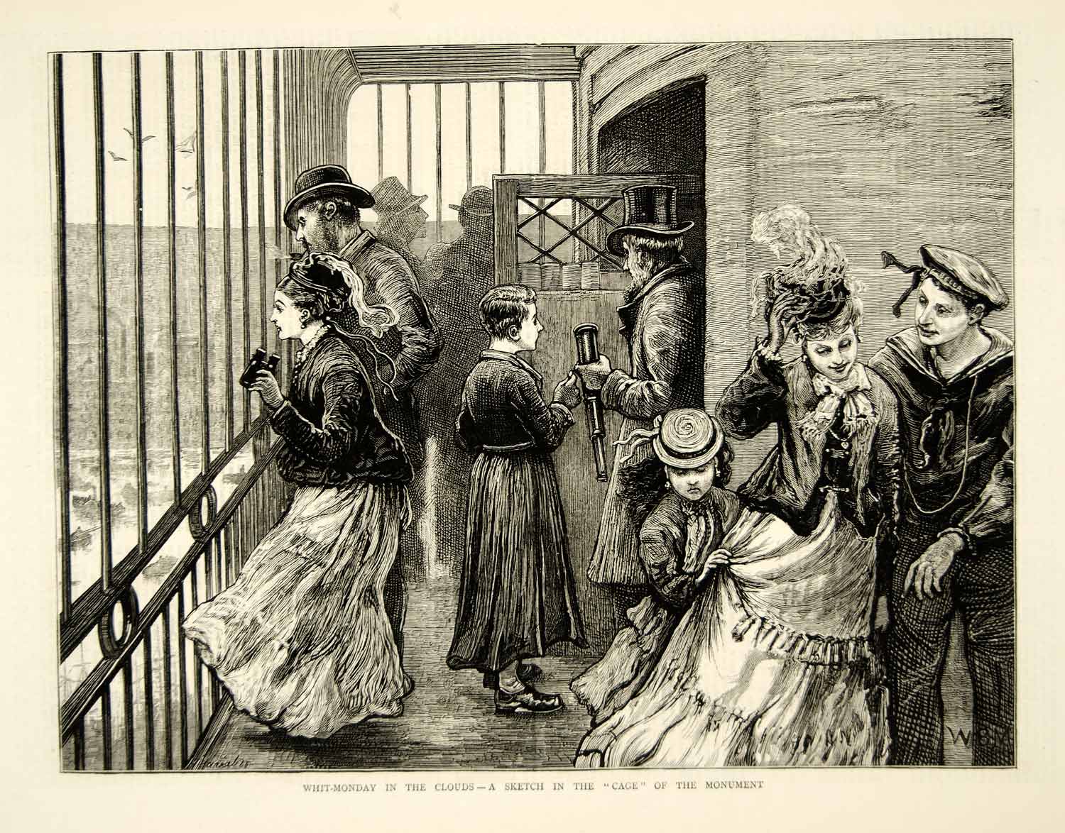 This is an original 1874 black and white in-text wood engraving of an illustration that depicts Londoners inside the enclosed viewing platform at the Monument to the Great Fire of London that is located at the junction of Monument Street and Fish Street Hill in London, England. "The Monument", as it is commonly known as, is a Roman Doric column of Portland stone that stands 202 ft tall and that was built between 1671-1677 as a memorial to the Great Fire of London in 1666.