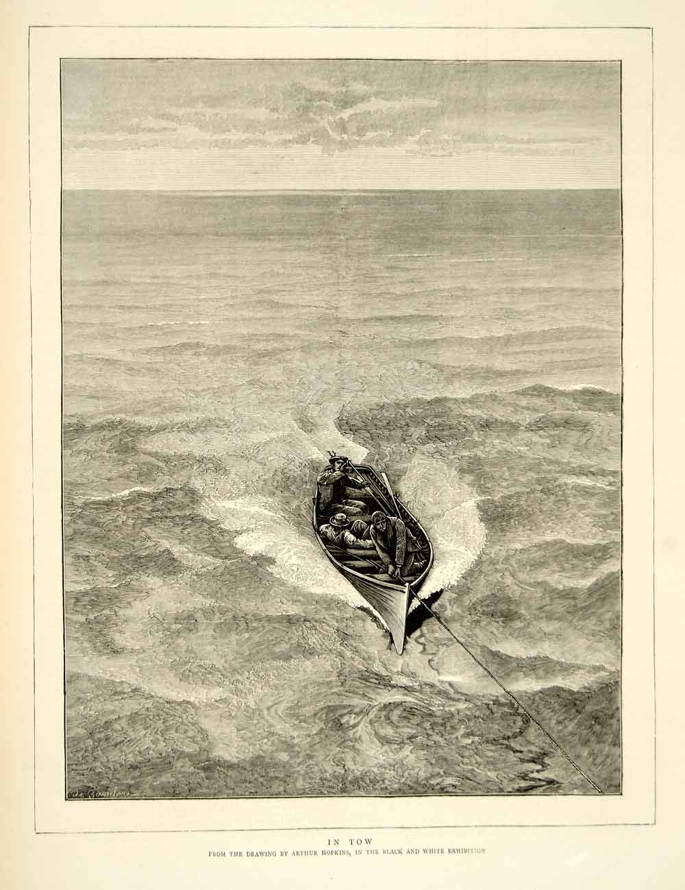 This is an original 1874 black and white in-text wood engraving of a drawing by Arthur Hopkins (1848-1930) entitled, "In Tow" that depicts a small boat being towed in by a sailing ship on the ocean.