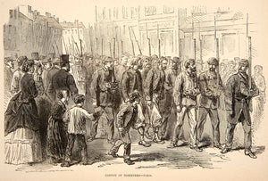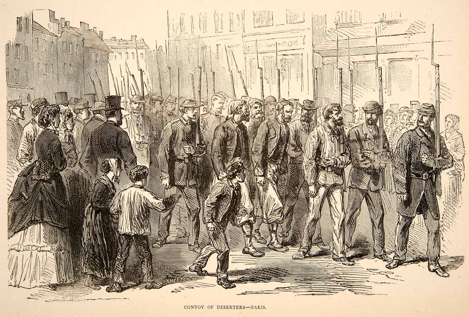 This is an original 1874 black and white in-text wood engraving of a convoy of Deserters marching through the streets of Paris, France during the Franco-Prussian War.