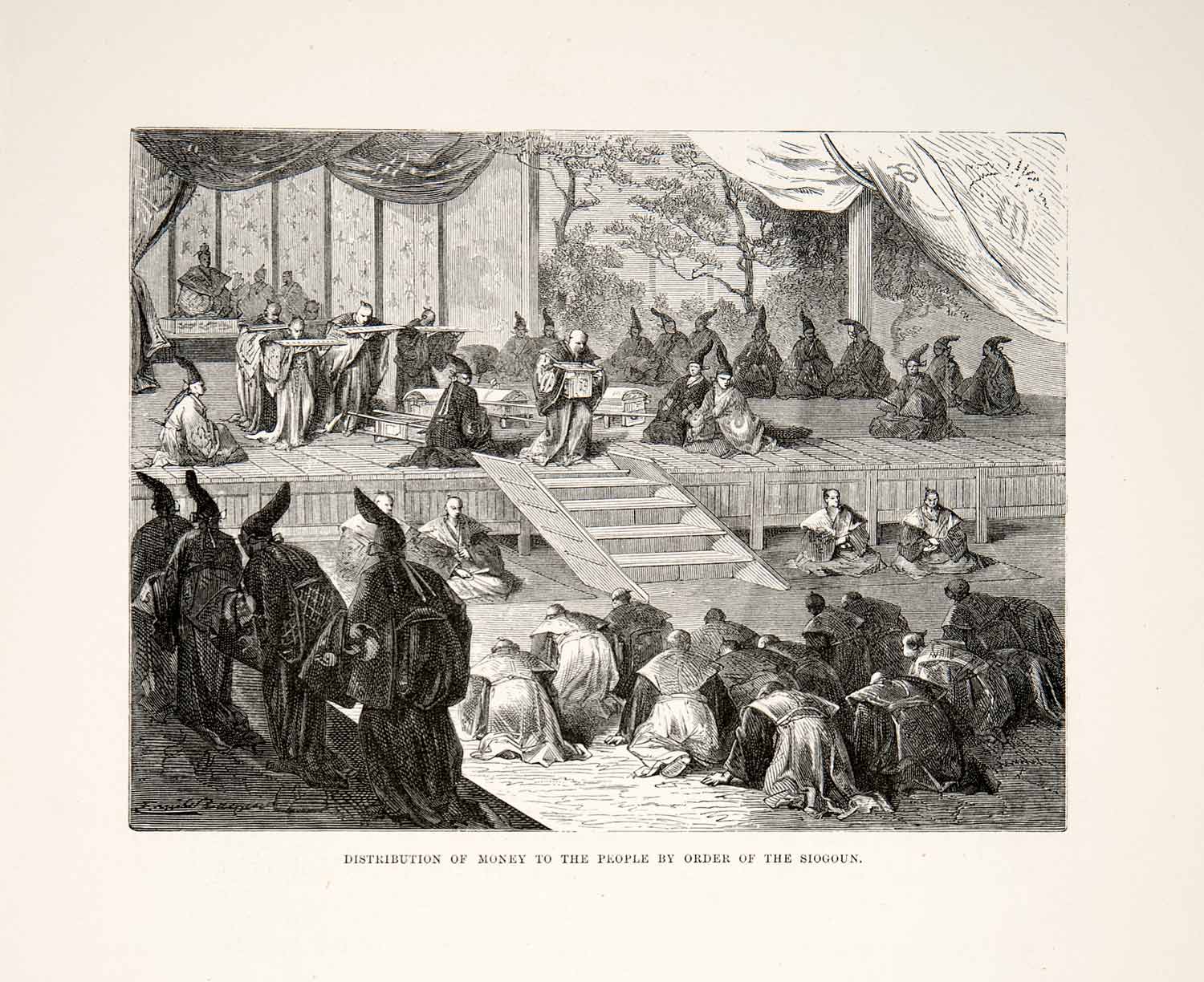 This is an original 1874 black and white in-text wood engraving of the distribution of money to the people, by order of the Tokugawa Shogunate Regime in Japan.
