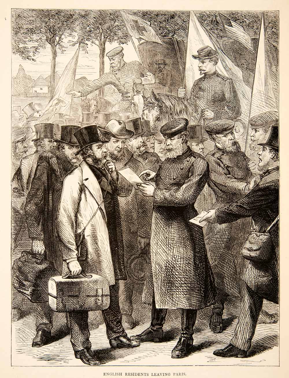 This is an original 1874 black and white in-text wood engraving of a group of English residents leaving Paris, France.
