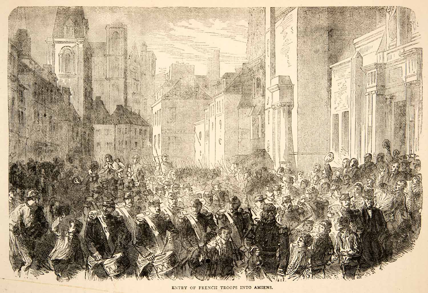 This is an original 1874 black and white in-text wood engraving of the entry of French Troops into Amiens.