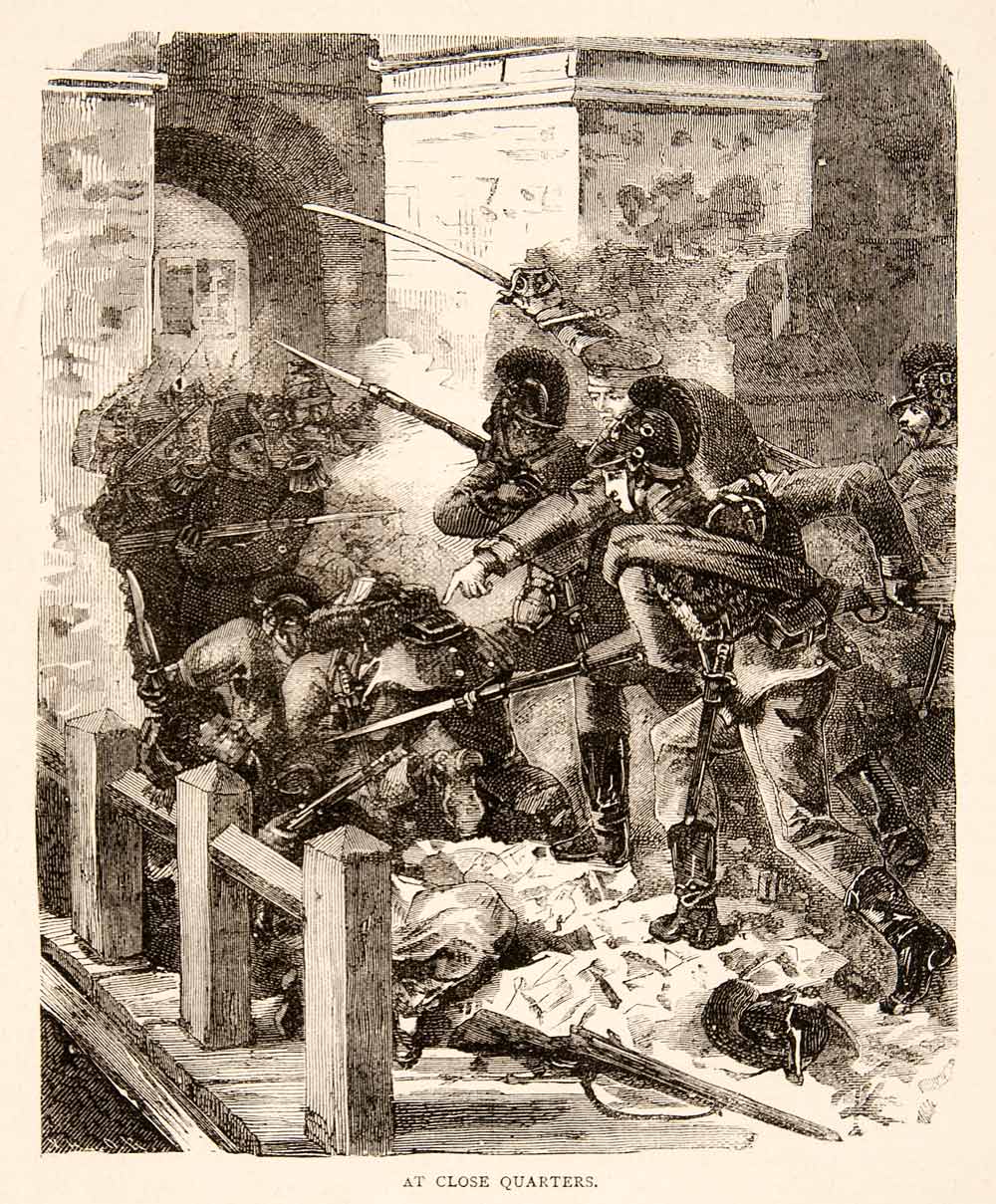 This is an original 1874 black and white in-text wood engraving of an image of close quarters fighting during the Franco-Prussian War.