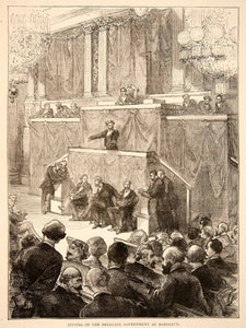 This is an original 1874 black and white in-text wood engraving of the sitting of the delegate government at Bordeaux, France during the Franco-Prussian War.