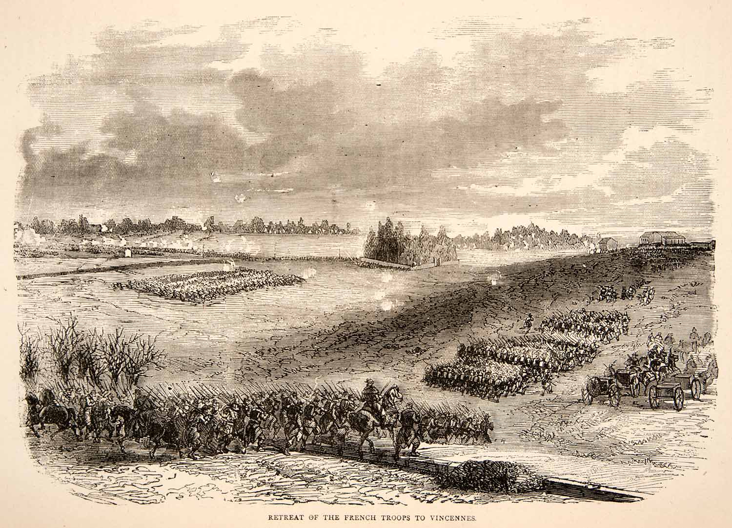 This is an original 1874 black and white in-text wood engraving of the retreat of the French Troops to Vincennes during the Franco-Prussian War.