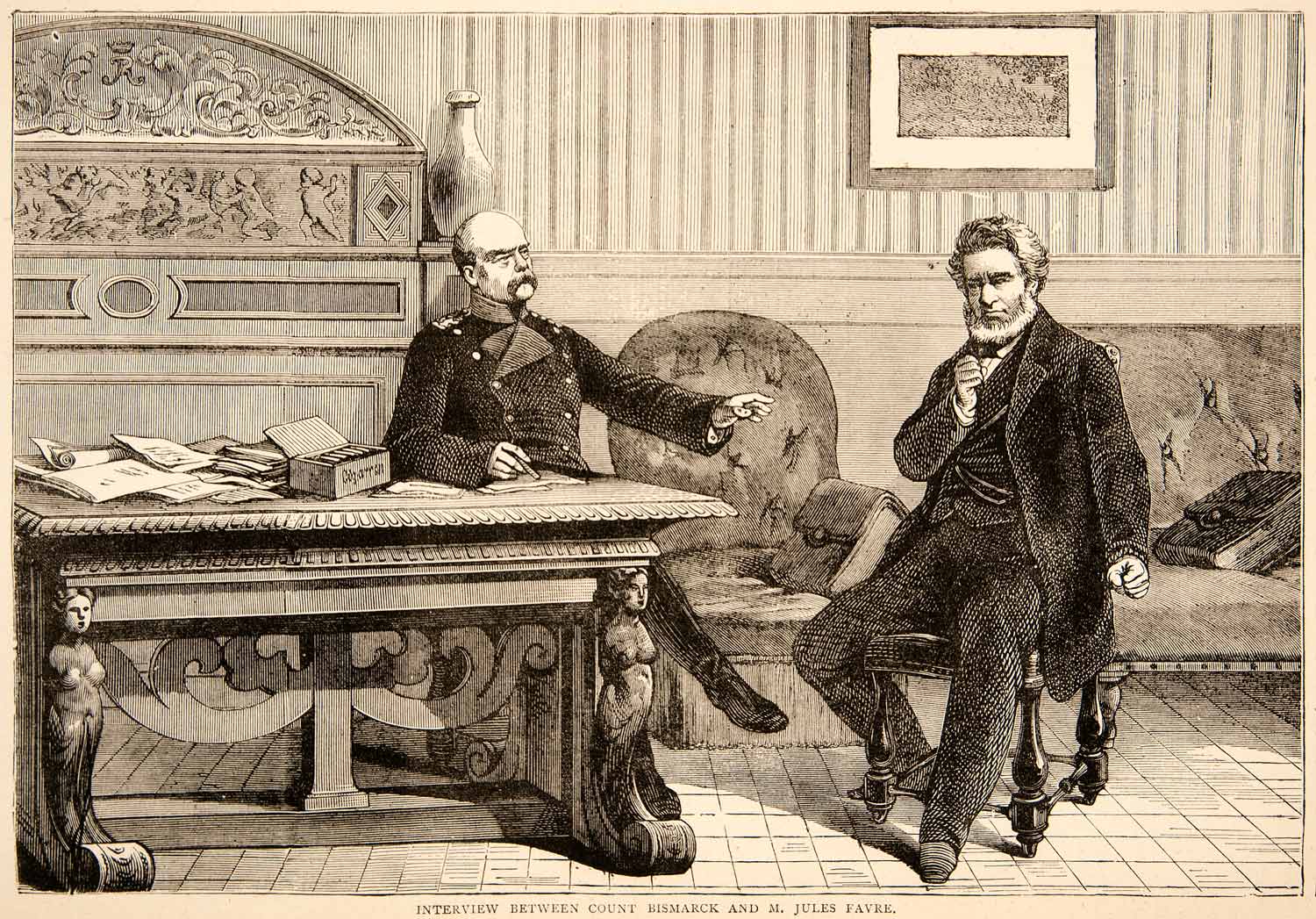 This is an original 1874 black and white in-text wood engraving of an interview between Count Bismark and Jules Favre during the Franco-Prussian War.