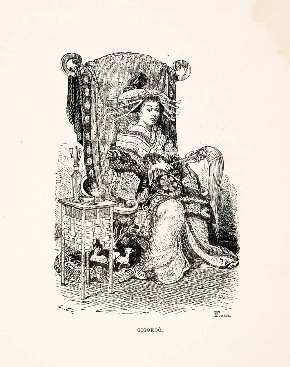 This is an original 1874 black and white in-text wood engraving portrait of the Japanese Gigokoô.