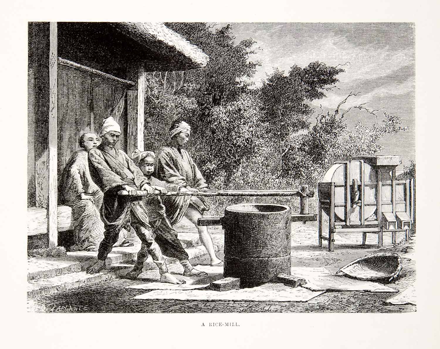 This is an original 1874 black and white in-text wood engraving of a traditional Japanese rice-mill. The process has since been mechanized, making it much quicker and easier.