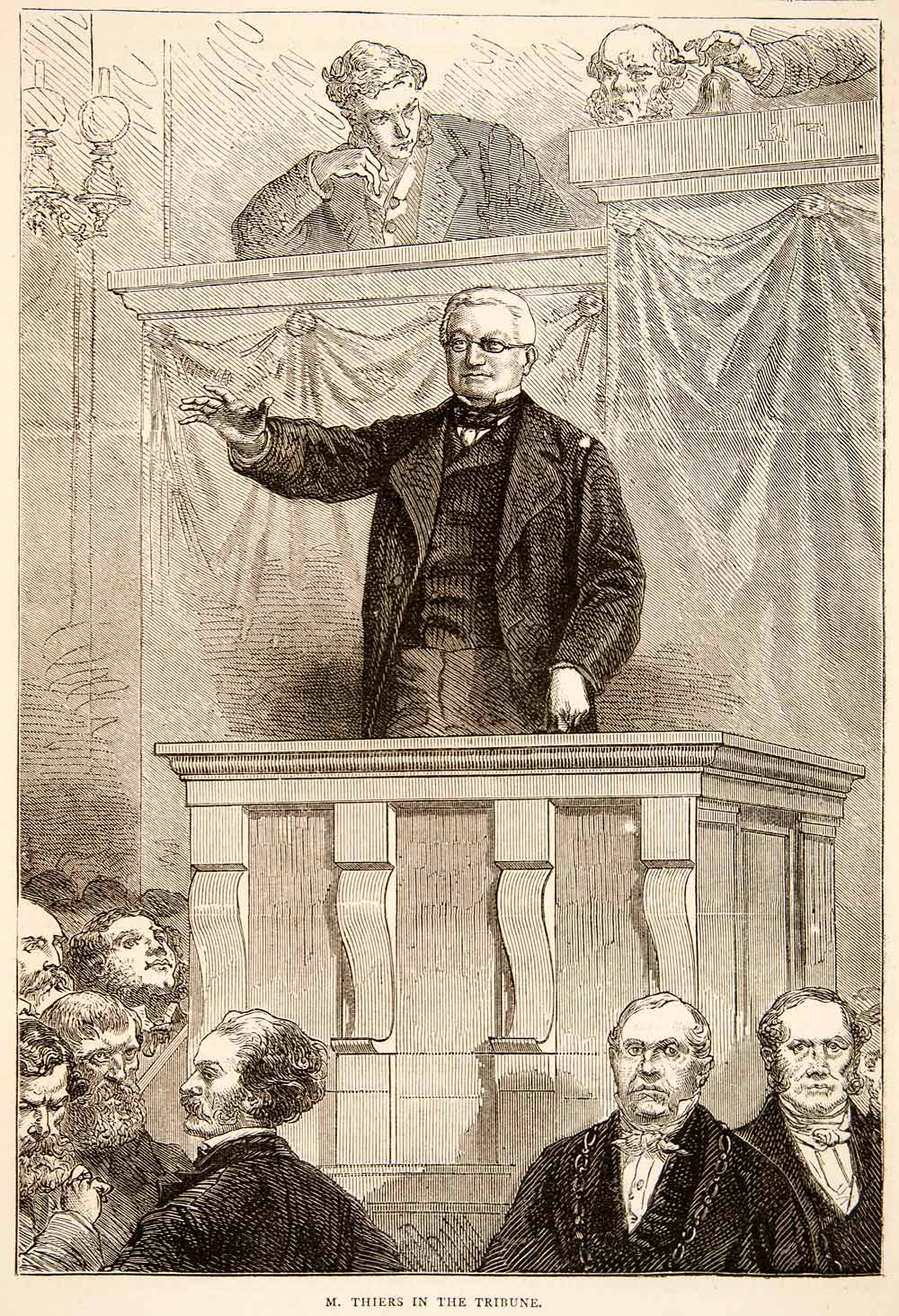 This is an original 1874 black and white in-text wood engraving of Adolphe Thiers, in the tribune in Paris, France.